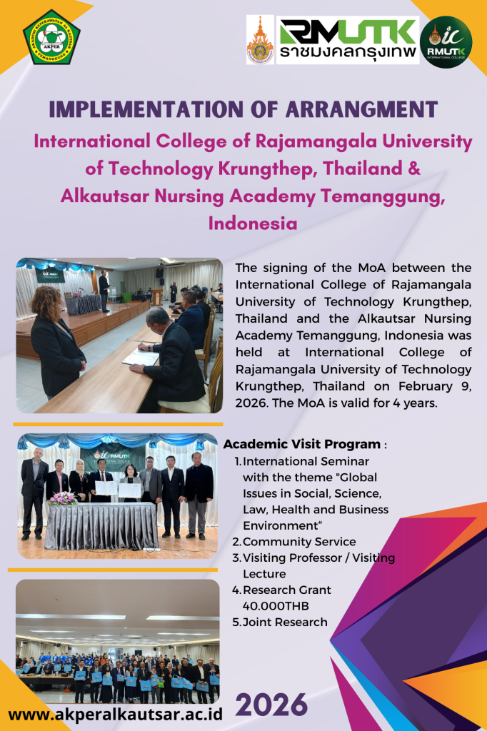 Akper Alkautsar Temanggung terus memperkuat jejaring internasional dengan menjalin kemitraan akademik bersama Rajamangala University of Technology Krungthep melalui International College of Rajamangala University of Technology Krungthep. Kerja sama ini ditandai dengan penandatanganan Memorandum of Agreement (MoA) yang dilaksanakan pada 9 Februari 2026 di Bangkok, Thailand.
