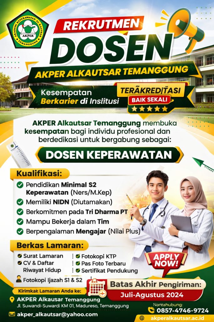 Dengan dibukanya rekrutmen ini, AKPER Alkautsar Temanggung berharap dapat menjaring tenaga pendidik profesional yang siap berkontribusi dalam mencetak perawat-perawat unggul dan berdaya saing tinggi di dunia kesehatan.